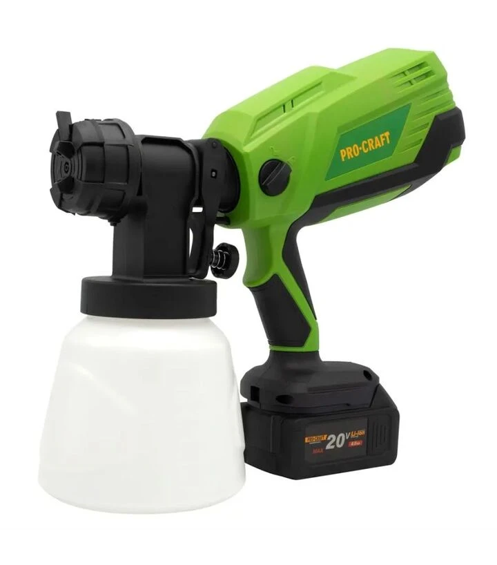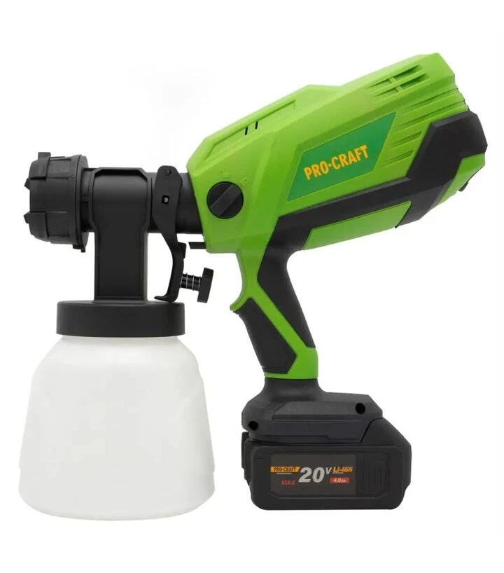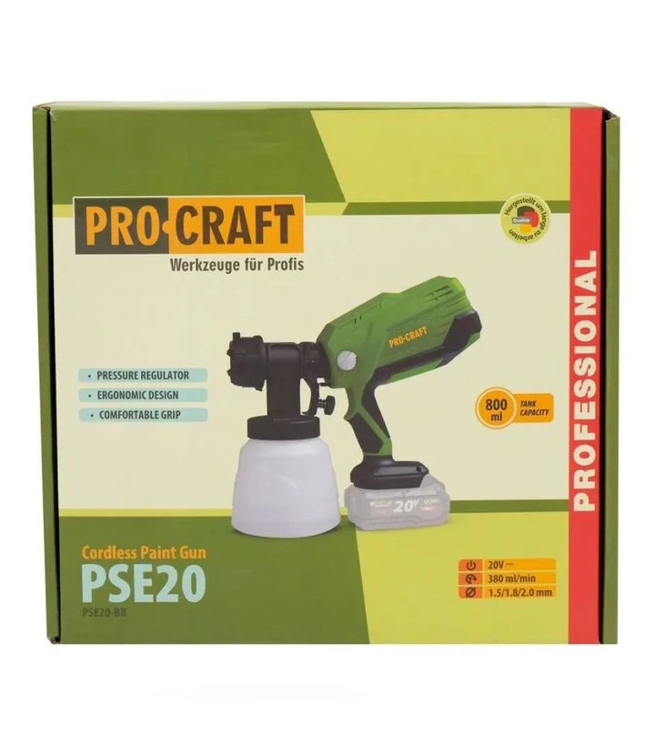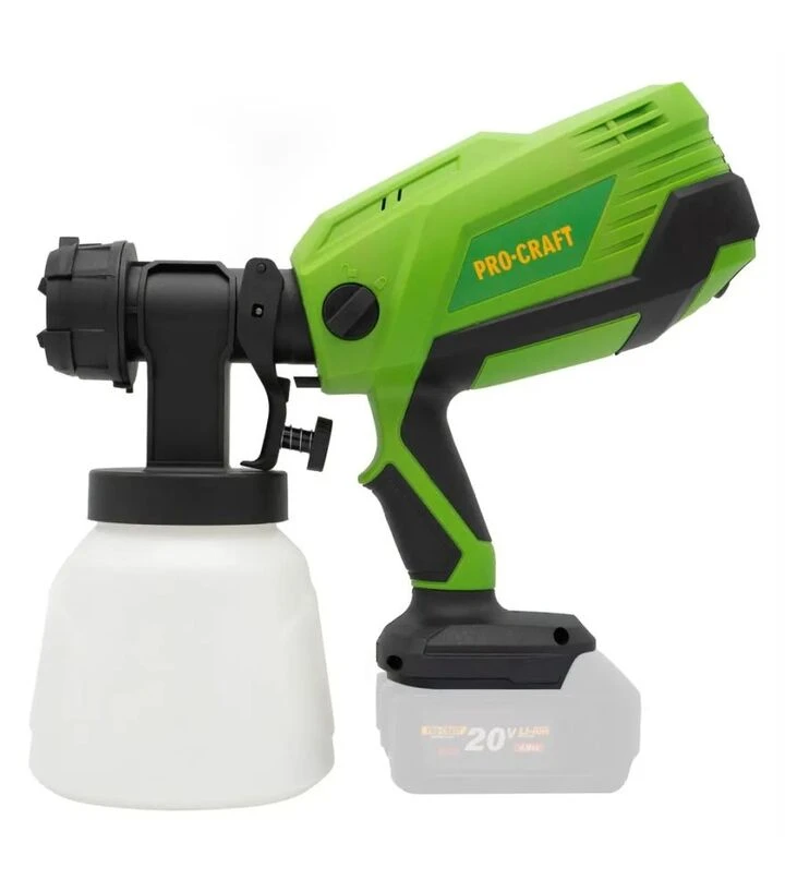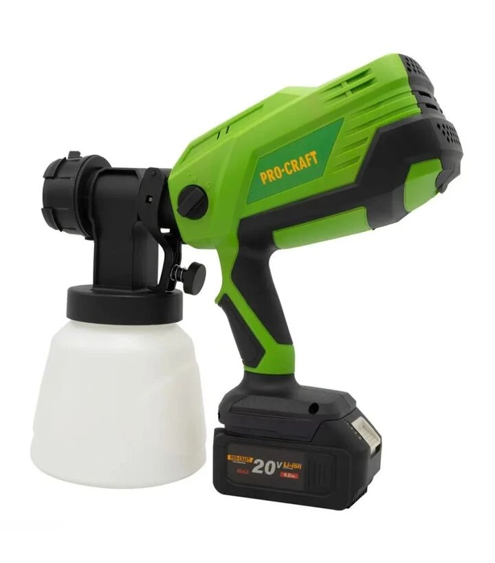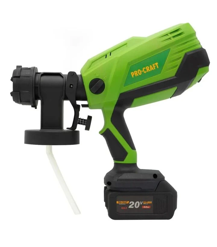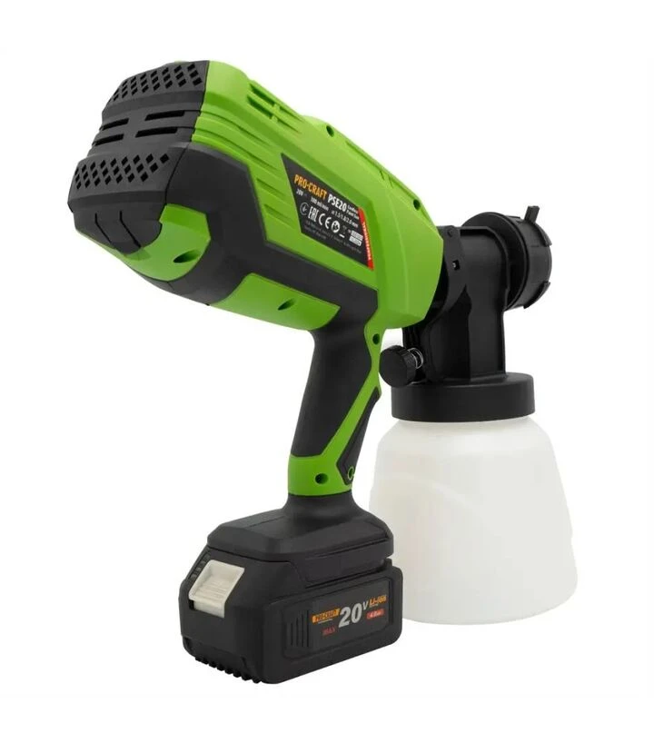 Procraft PSE-20 - это базовый инструмент для покраски без сложностей, подходящий для хозяйственных задач и мелкого ремонта. Простая конструкция, совместимость с АКБ бренда и возможность работы без сети делают его удобным в использовании.
