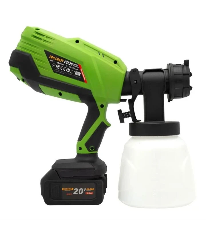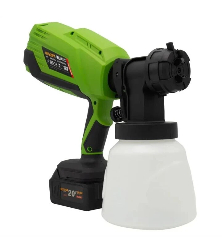 Модель PSE-20 имеет простую конструкцию и понятное управление, что позволяет быстро приступить к работе. Пластиковый корпус уменьшает вес инструмента, а форма ручки обеспечивает удобное удержание. Прибор оптимально подходит для небольших ремонтных или отделочных работ. Нижнее расположение бачка помогает сохранять стабильный поток краски даже при наклонах. Важно учитывать, что аккумулятор и зарядное устройство нужно приобретать отдельно.