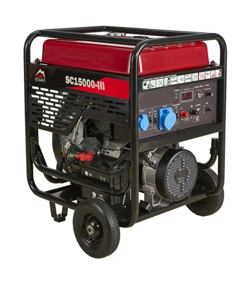Генератор VULKAN SC15000-III выполнен в портативном (переносном) формате с рамой и габаритами примерно 820×930×660 мм и весом около 200 кг, что обеспечивает устойчивость во время работы. Воздушная система охлаждения рассчитана на длительную работу в пределах заявленной нагрузки. Для подключения потребителей предусмотрена розетка 220 В, а система аварийной остановки отключает агрегат при критических режимах, защищая двигатель и оборудование.