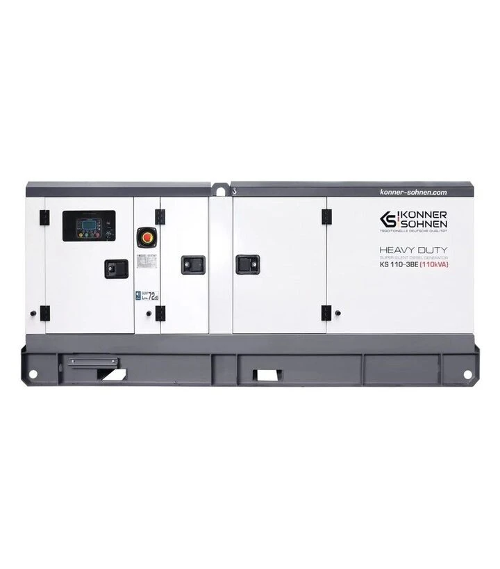 Генератор дизельный Könner&Söhnen KS 110-3BE предназначен для стационарного автономного или резервного электроснабжения объектов с высоким потреблением электроэнергии. Оборудование используется на производственных предприятиях, в складских комплексах, аграрных хозяйствах, строительных объектах или коммерческих помещениях, где необходимо стабильное трехфазное электропитание. Генератор формирует трехфазное напряжение 400 В с частотой 50 Гц, что соответствует стандартным параметрам промышленных электросетей. Номинальная мощность установки составляет 80 кВт, что позволяет обеспечивать питание большого количества электропотребителей, включая оборудование, системы освещения, инструменты и другие электроприборы. Генератор оснащен дизельным четырехтактным двигателем, рассчитанным на стабильную работу при длительных нагрузках. Жидкостная система охлаждения поддерживает стабильную рабочую температуру двигателя и обеспечивает эффективную работу установки во время длительной эксплуатации. Синхронный альтернатор с медной обмоткой обеспечивает стабильную генерацию электроэнергии, а система автоматической стабилизации напряжения AVR помогает поддерживать равномерные параметры напряжения.