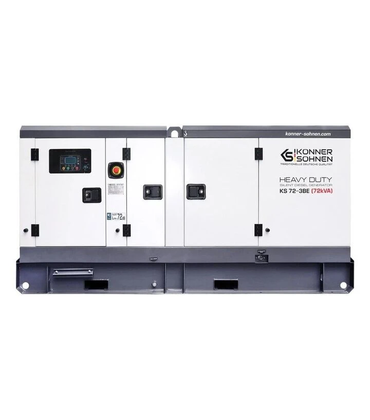 Генератор дизельный Könner&Söhnen KS 72-3BE предназначен для автономного или резервного электроснабжения объектов с трехфазной электросетью. Генератор используется в производственных помещениях, фермерских хозяйствах, складских комплексах, на строительных площадках и других объектах, где необходима стабильная генерация электроэнергии. Оборудование формирует трехфазное напряжение 400 В с частотой 50 Гц, что соответствует стандартным параметрам промышленных электросетей. Номинальная мощность генератора составляет 65 кВт, что позволяет обеспечивать питание различных электропотребителей, включая производственное оборудование, электроинструменты, системы освещения и другие электроприборы. Генератор оснащен дизельным четырехтактным двигателем, рассчитанным на стабильную работу при длительной нагрузке. Жидкостная система охлаждения поддерживает оптимальную температуру двигателя во время работы. Синхронный альтернатор с медной обмоткой обеспечивает стабильную генерацию электроэнергии, а система автоматической стабилизации напряжения AVR поддерживает стабильные параметры электропитания.