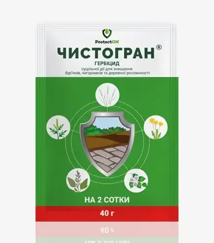 Чистогран ефективно бореться з однорічними й багаторічними бур'янами, забезпечуючи тривалий контроль бур'янів до 6 тижнів. Він починає діяти вже через кілька годин після внесення, із загибеллю бур'янів протягом 1-2 тижнів. Препарат безпечний для довкілля, не викликає забруднення ґрунту та води й не викликає шкоди культурним рослинам під плівкою.