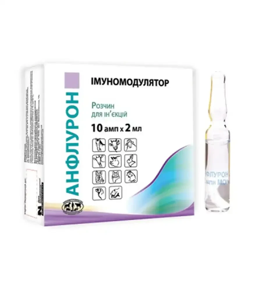 Иммуностимулятор Анфлурон — инъекционный иммуностимулятор на основе рекомбинантного интерферона альфа-2b. Используется для лечения и профилактики вирусных, инфекционных, инвазионных и онкологических заболеваний у животных и птицы. Поддерживает иммунитет, обладает противовирусным и противоопухолевым действием.