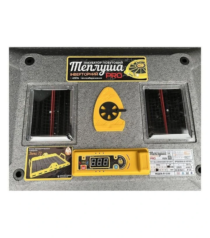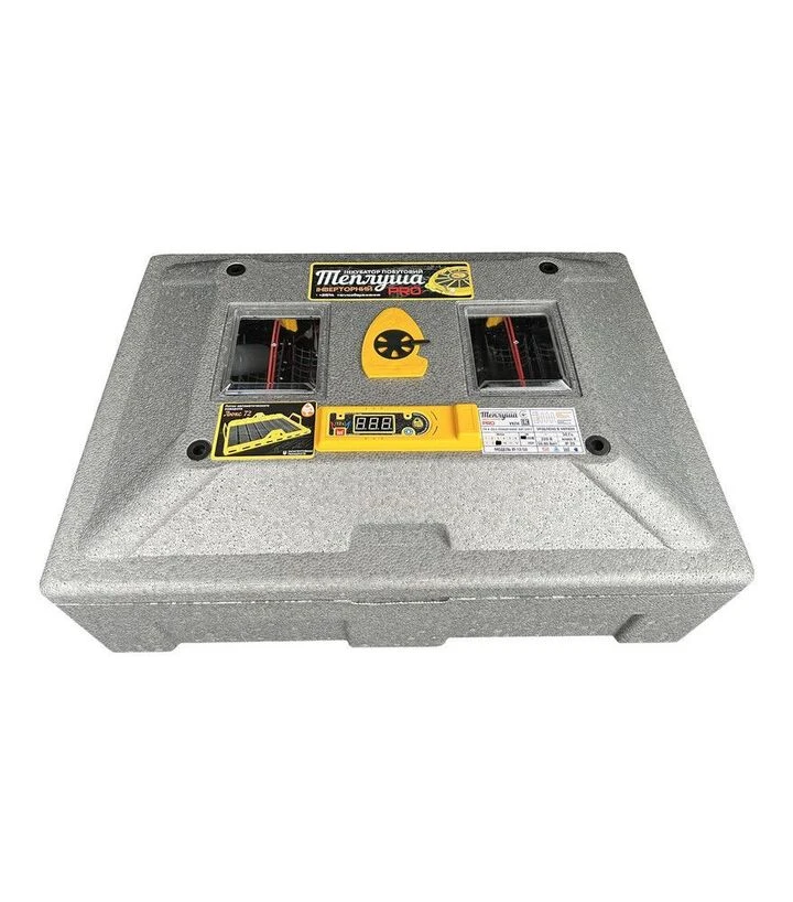 Инкубатор автоматический инверторный Теплуша PRO 12 ТАВ - это бытовой инкубатор для вывода птенцов из яиц различного размера. Устройство работает как от электросети 220 В, так и от аккумулятора 12 В (аккумулятор в комплект не входит). Оснащён автоматическим переворотом яиц (от 2 до 24 раз в сутки), электронным терморегулятором с точностью 0.1 °C, встроенным влагомером и турбо-вентилятором для принудительного воздухообмена. Температурный режим регулируется в диапазоне от 30 до 40 °C. Имеет прочный пенопластовый корпус, съёмный лоток, адаптер с зажимами (крокодилами), инструкцию по настройке и эксплуатации. Подходит для куриных, утиных, гусиных, индюшиных и перепелиных яиц. Комплектация и цвет могут отличаться в зависимости от партии производителя.