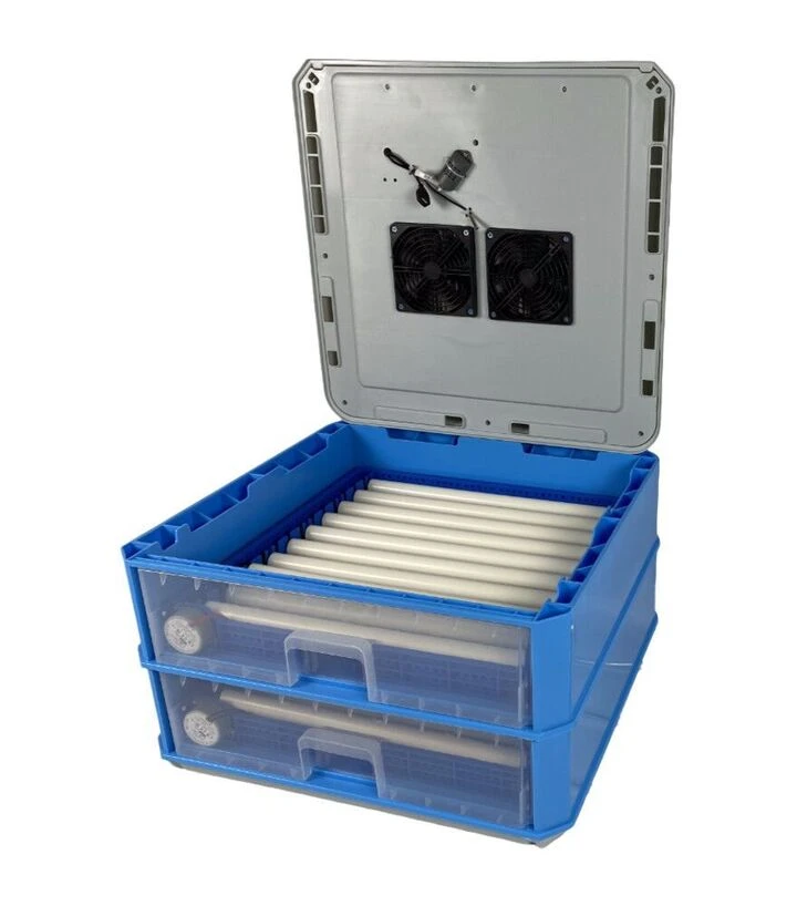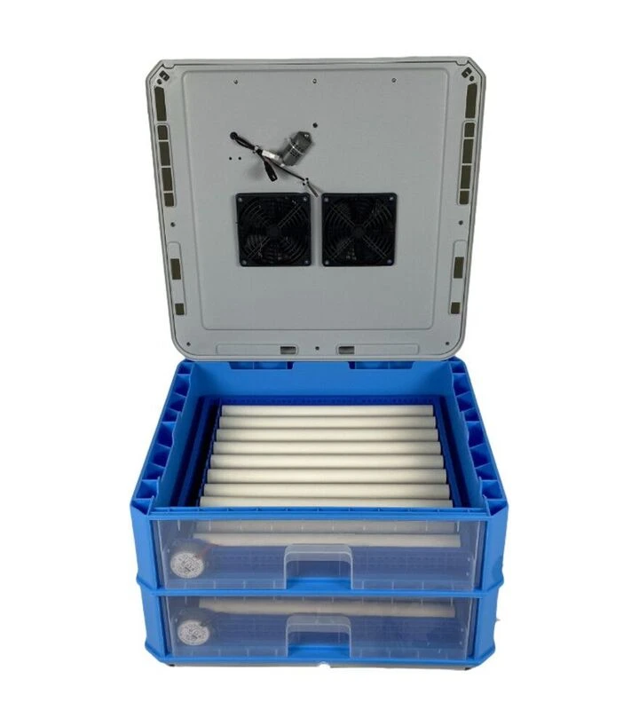 В крышку инкубатора встроены два вентилятора, которые равномерно распределяют тепло внутри. Источником нагрева служит тепловой шнур (ТЭН), обеспечивающий постоянную стабильную температуру. Ультразвуковой увлажнитель автоматически поддерживает необходимый уровень влажности без использования чаш или канавок с водой. В верхней части корпуса предусмотрено отдельное отверстие для вывода углекислого газа.