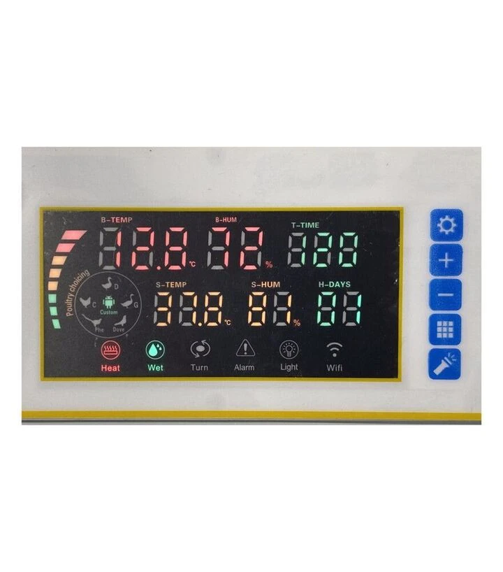 Панель управления содержит дисплей с отображением следующих параметров: установленная и текущая температура, установленная и текущая влажность, таймер переворота, счётчик дней, активный режим инкубации. Для навигации предусмотрены кнопки SET, MODE, «+» и «–». Овоскоп размещён в верхней части крышки и активируется отдельной кнопкой. Все элементы управления доступны снаружи - открывать инкубатор не требуется.