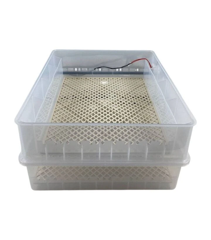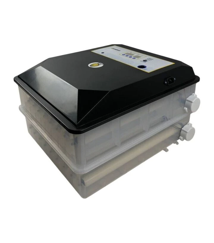 Инкубатор оснащён двухъярусной системой лотков, что позволяет эффективно использовать внутреннее пространство и увеличить общую вместимость. Роликовый переворот адаптируется под размер яйца - это упрощает переход между видами птицы без необходимости менять оборудование. Датчики температуры и влажности можно откалибровать под нужды конкретного хозяйства.