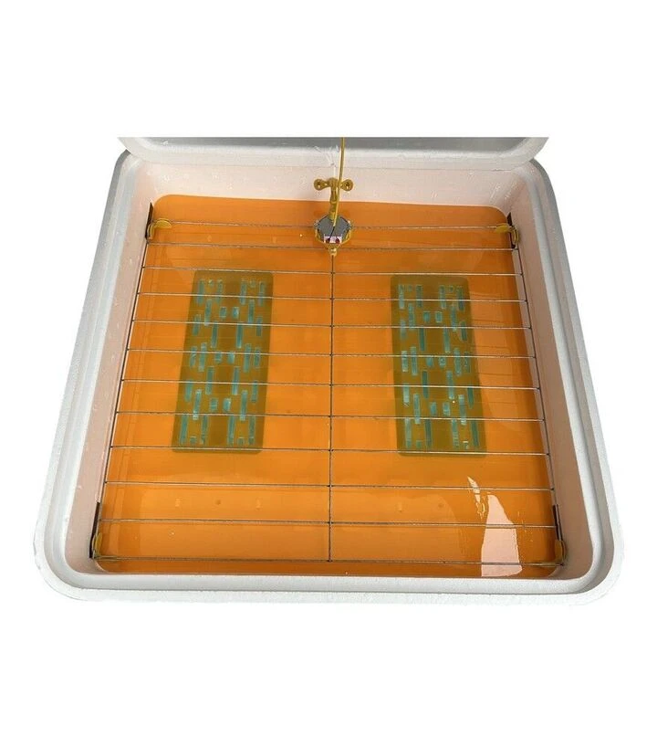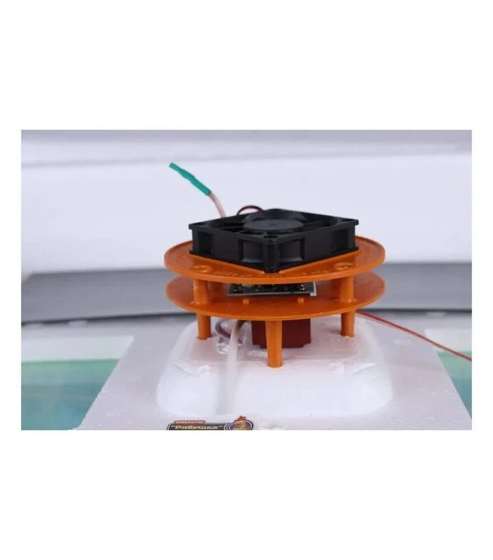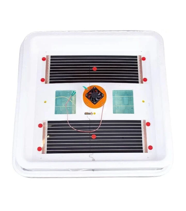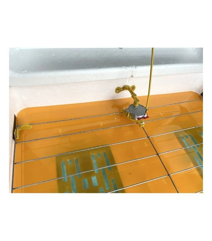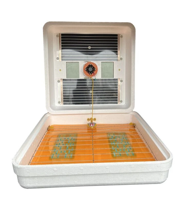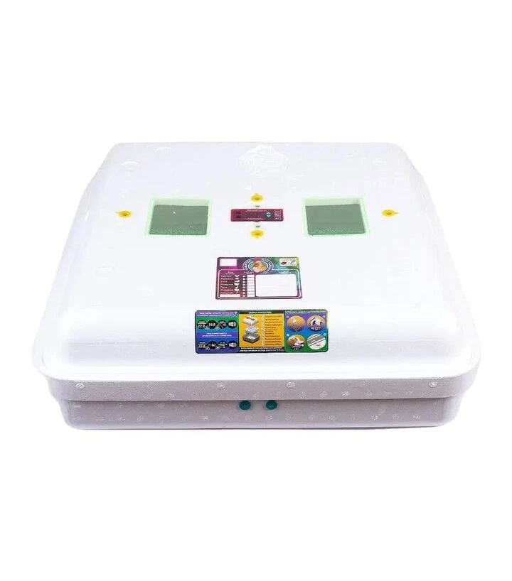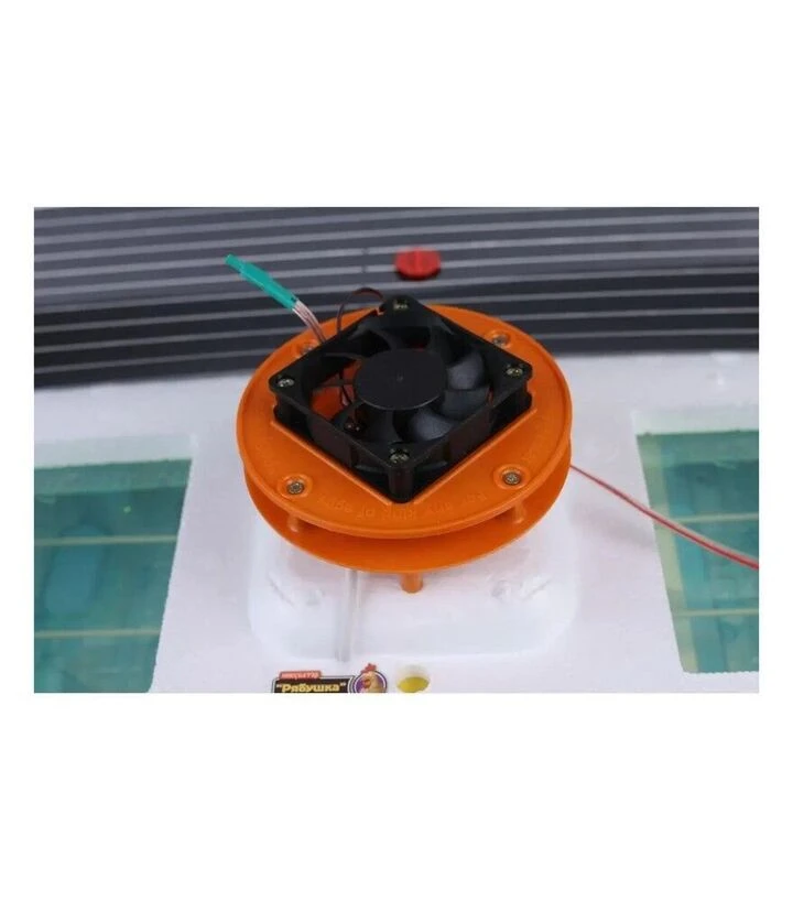 Инкубатор оснащён горизонтальной сеткой, которая обеспечивает одновременный переворот большого количества яиц. Вентиляция обеспечивает постоянное перемешивание воздуха внутри камеры, что способствует равномерному обогреву. Влажность поддерживается путём заполнения специальных канавок водой. Дополнительное оборудование - цифровой гигрометр - можно заказать отдельно.
