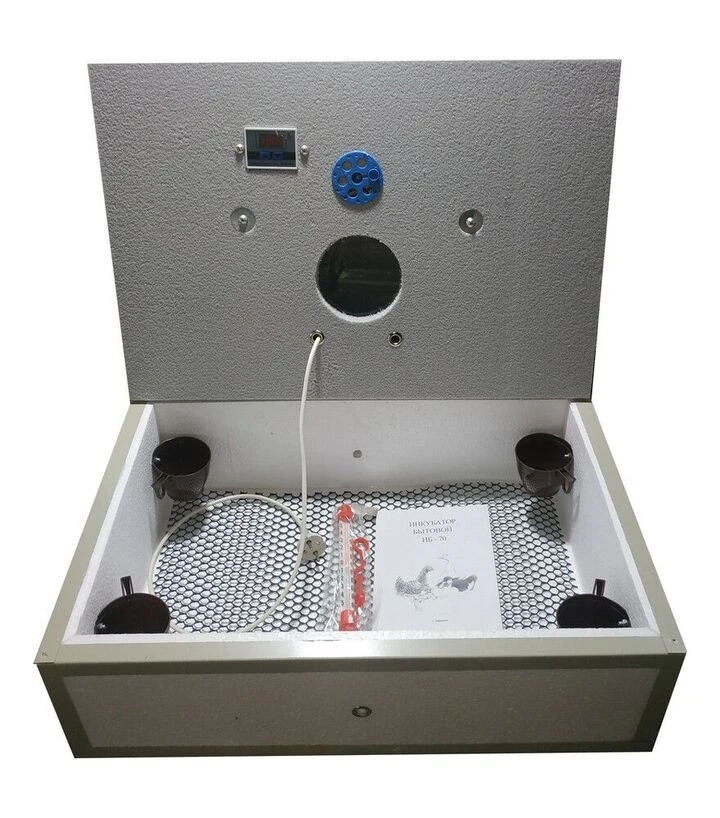 Бытовой инкубатор с ручным переворотом Наседка 70 предназначен для вывода птенцов различных видов: кур, уток, гусей, индюков, перепелов, а также певчих и экзотических птиц. Конструкция простая, удобная в использовании, изготовлена из пенопласта с усилением металлическими уголками. Имеет смотровое окно в крышке, ламповый нагрев мощностью 80 Вт, цифровой терморегулятор с точностью до 0.1°С. Переворот яиц осуществляется вручную каждые 10–15 часов. Подходит для использования в отапливаемых помещениях при температуре воздуха от +15°С до +35°С.