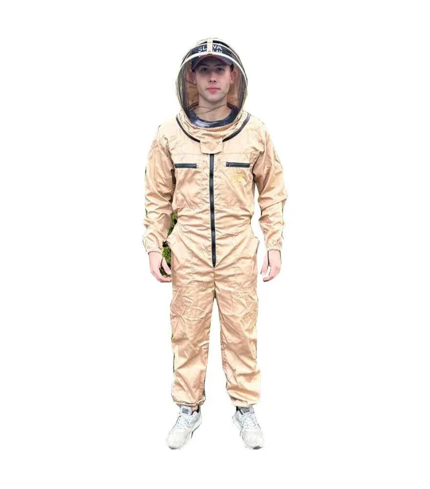 Комбинезон надевается поверх основной одежды и полностью закрывает тело. Евро-маска интегрирована в конструкцию и создаёт защитное пространство вокруг лица. Металлическая сетка удерживает пчёл на безопасном расстоянии. Резинки на манжетах рукавов и внизу штанин плотно фиксируют одежду, препятствуя попаданию пчёл внутрь.