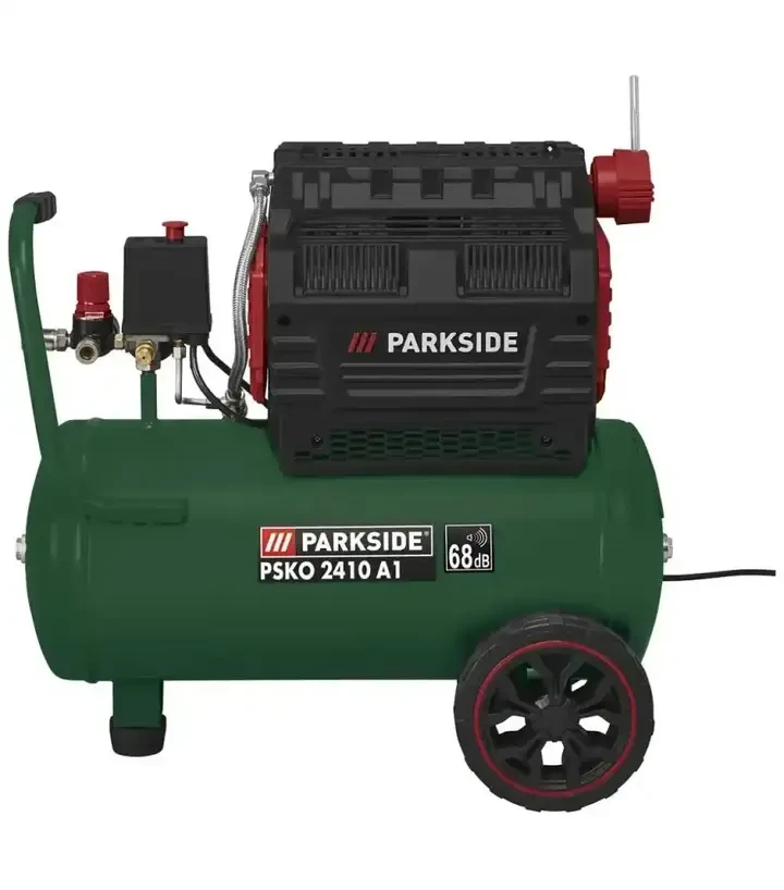 Комплектация: Компресор Parkside PSKO 2410 A1 1 шт; Транспортувальні колеса 2 шт; Повітряний фільтр 1 шт; Паспорт 1 шт; Упаковка картонна 1 шт