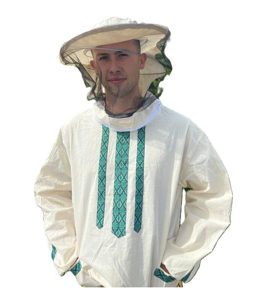 Куртка пчеловода с маской евро в стиле вышиванки предназначена для работы на пасеке и сочетает защитную функцию с традиционным оформлением. Используется при осмотрах ульев, уходе за пчелиными семьями и ежедневных пасечных работах. Куртка изготовлена из хлопчатобумажной ткани, которая хорошо пропускает воздух и обеспечивает комфорт в тёплое время года. Декоративный этнический дизайн позволяет сохранить практичность одежды без потери внешней привлекательности.