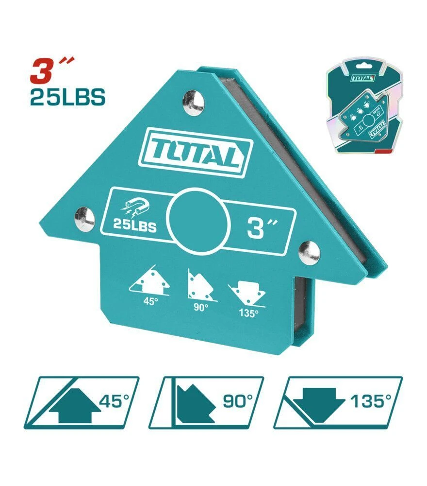 Магнитный угольник TOTAL TAMWH25032 предназначен для фиксации металлических деталей во время сварки, резки или сборки конструкций. Он обеспечивает надёжное удержание элементов под углами 45°, 90° и 135°, что упрощает работу и позволяет выполнять точное позиционирование без дополнительных опор. Благодаря силе сцепления 11,5 кг угольник удерживает детали разной толщины, а компактный размер 3″ делает его удобным для использования в мастерских и на монтажных площадках.