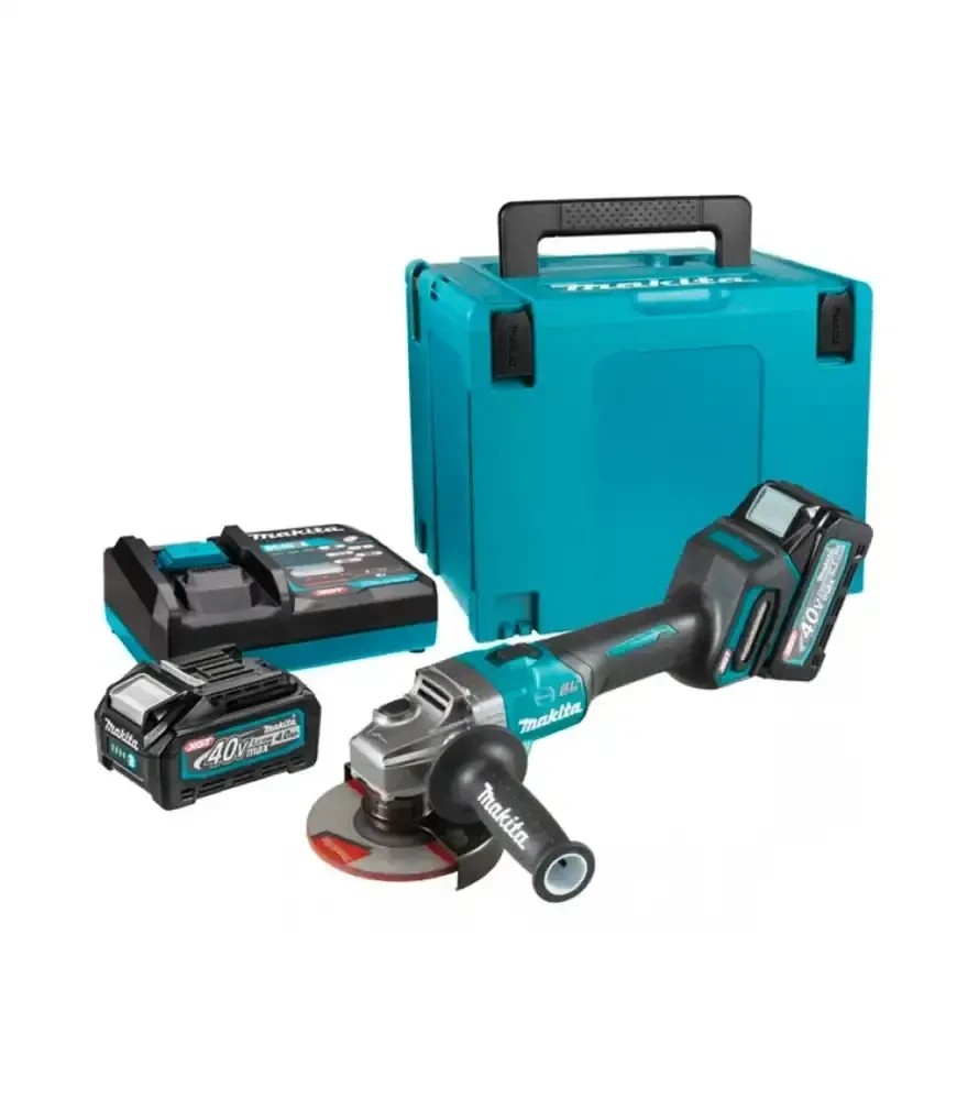 Комплектация: кейс; бічна рукоятка; захисний кожух; торцевий ключ (спецключ); акумуляторна батарея; зарядний пристрій; Болгарка; захисний кожух 125мм; бокова ручка; внутрішній фланець; гайка із фланцем; ключ для контргайки; інструкція з експлуатації; гарантійний талон; акумулятори BL4040 (2 шт.); зарядний пристрій DC40RA; MakPAc кейс