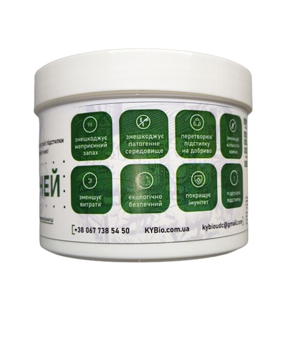 Биопрепарат для обработки подстилки в свинарниках. Создан для разложения навоза, уменьшения запаха, улучшения гигиены и превращения отходов в удобрение. Препарат действует за счёт активных бактерий и работает только во влажной среде.