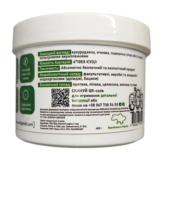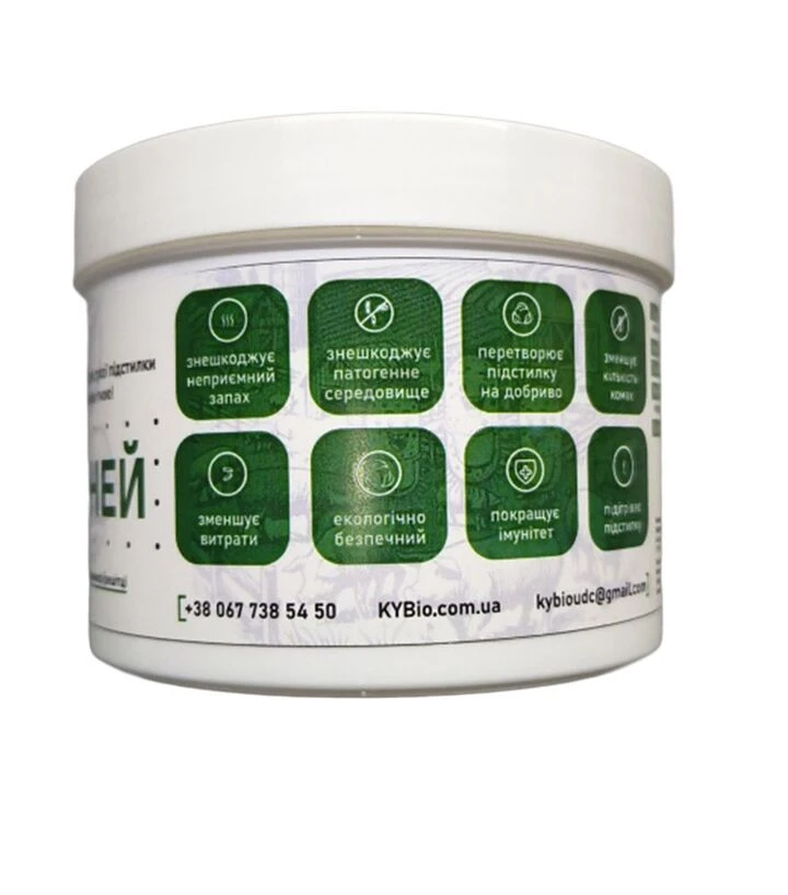Биопрепарат для обработки подстилки в свинарниках. Создан для разложения навоза, уменьшения запаха, улучшения гигиены и превращения отходов в удобрение. Препарат действует за счёт активных бактерий и работает только во влажной среде.