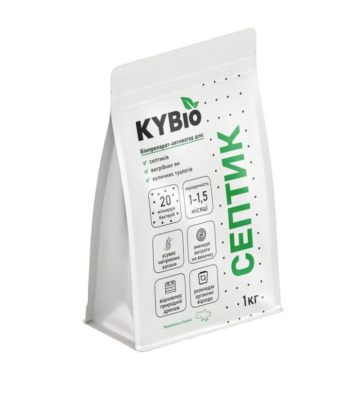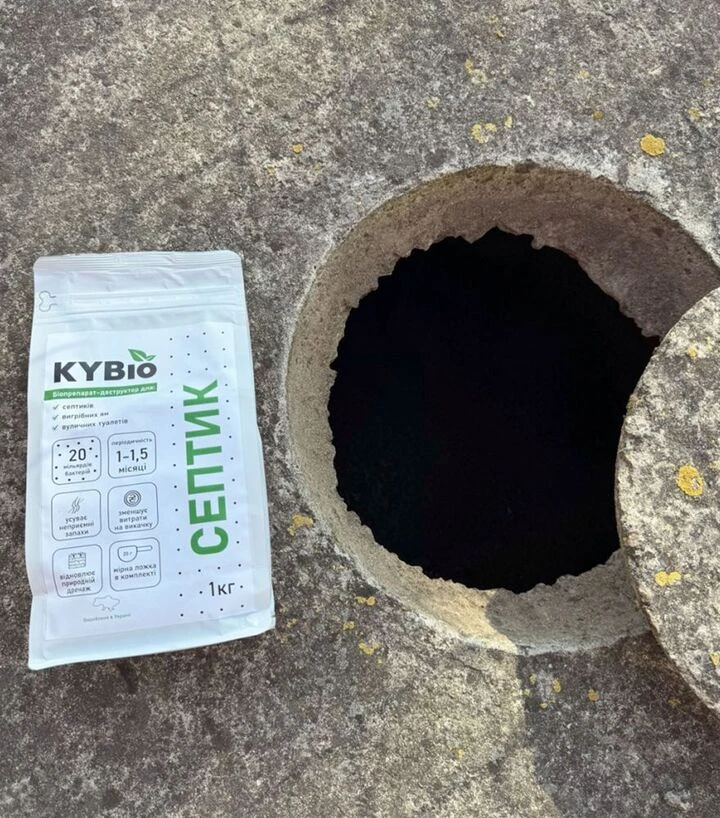 KYBIO Септик помогает поддерживать санитарные сооружения в надлежащем состоянии, снижает расходы на обслуживание и устраняет неприятные запахи. Безопасен для окружающей среды, не содержит химикатов.