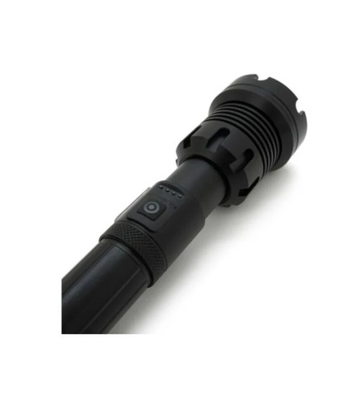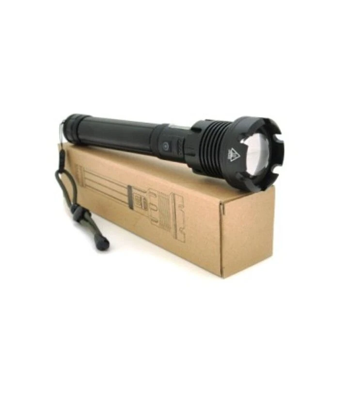 Фонарь имеет семь режимов работы, функцию ZOOM, световой поток 12000 лм и дальность освещения до 1100 м. Работает от аккумулятора типа 18650 (не входит в комплект), заряжается через micro USB. Корпус алюминиевый, класс защиты IP40.