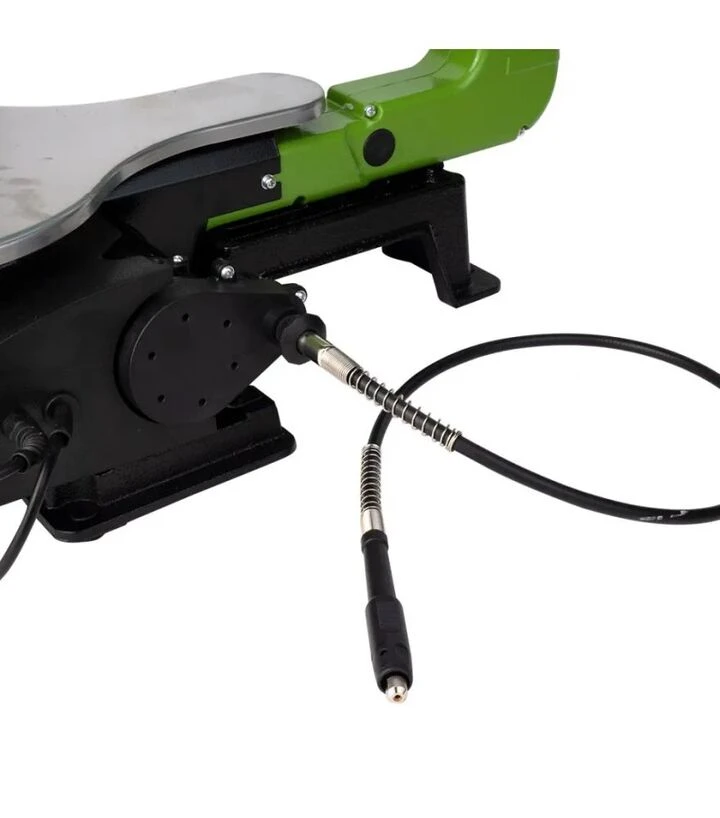 Регулируемая скорость и наклоняемый стол повышают универсальность. Гибкий вал позволяет выполнять точные и мелкие работы. Подсветка улучшает видимость.
