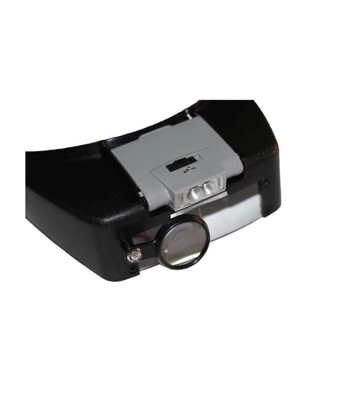 Лупа крепится на голову с помощью налобного обода. Основная линза обеспечивает базовое увеличение, а дополнительная подвижная линза перемещается легким движением пальца для повышения кратности. LED-подсветка с двумя светодиодами включается отдельно и позволяет регулировать направление света для удобного обзора.