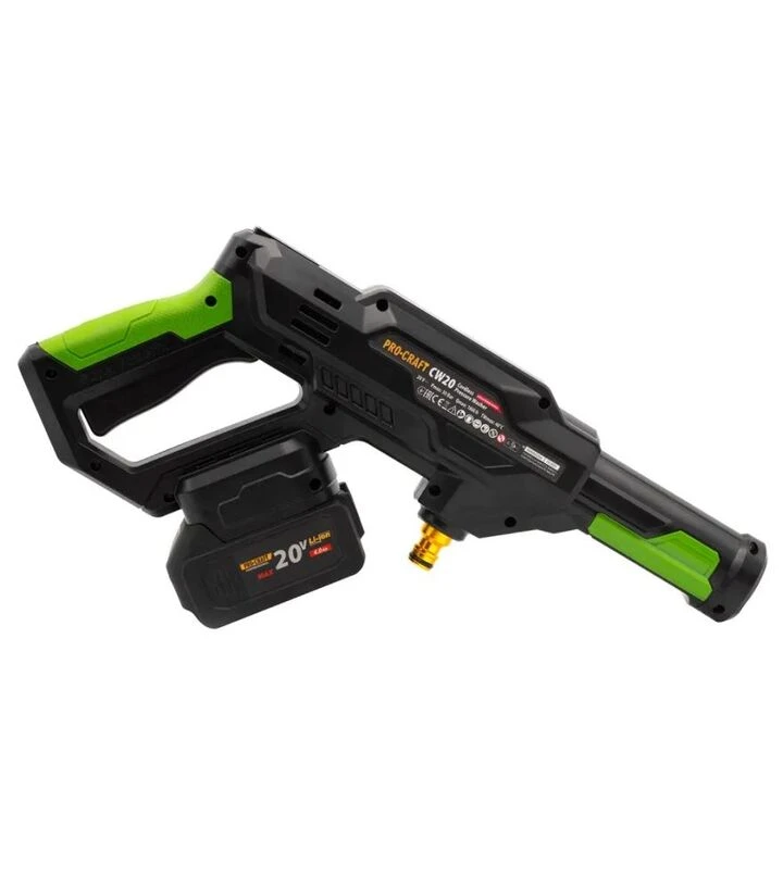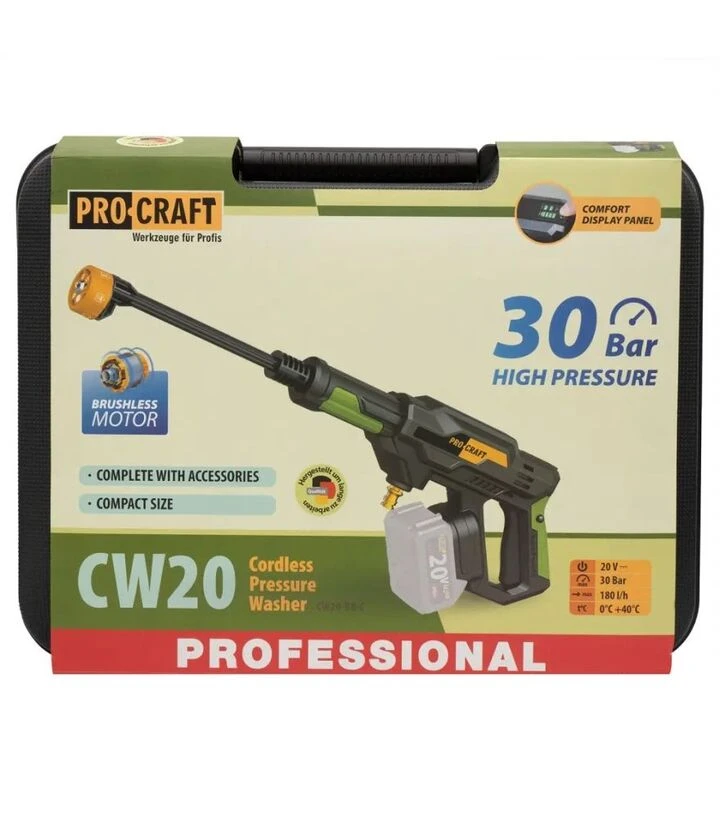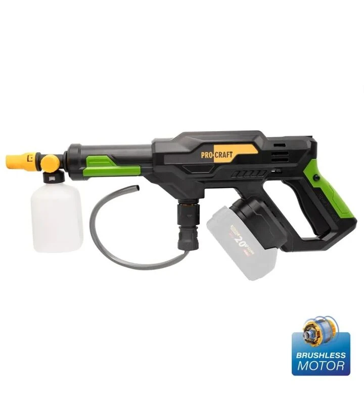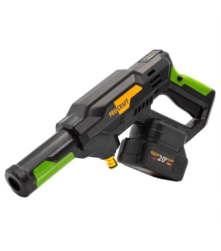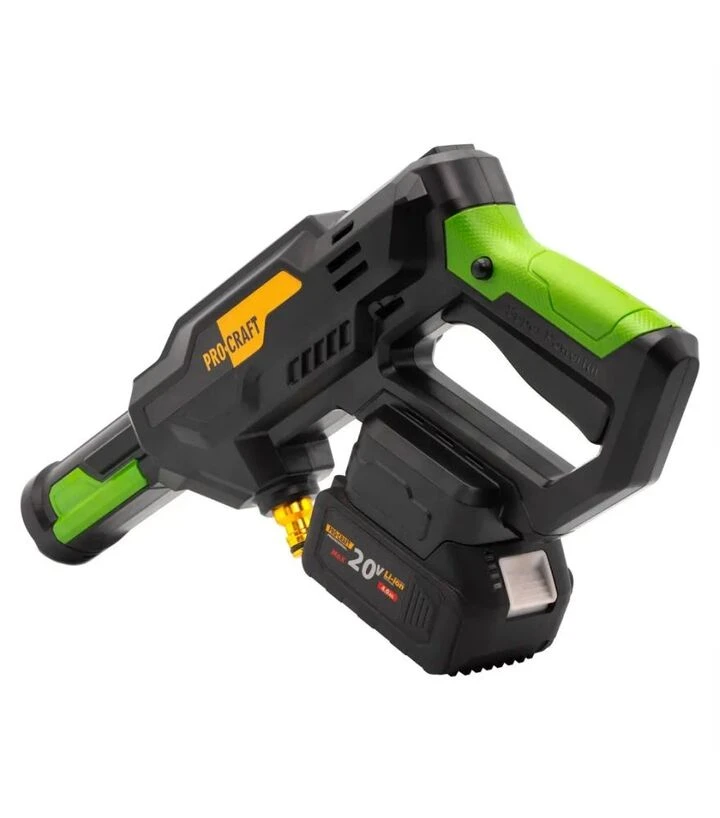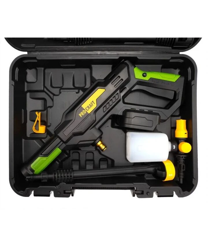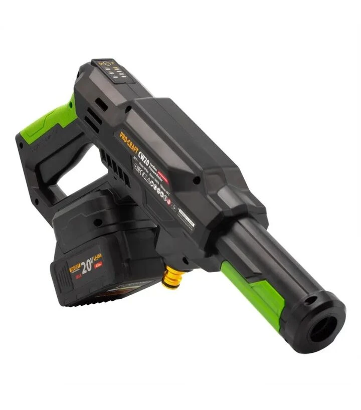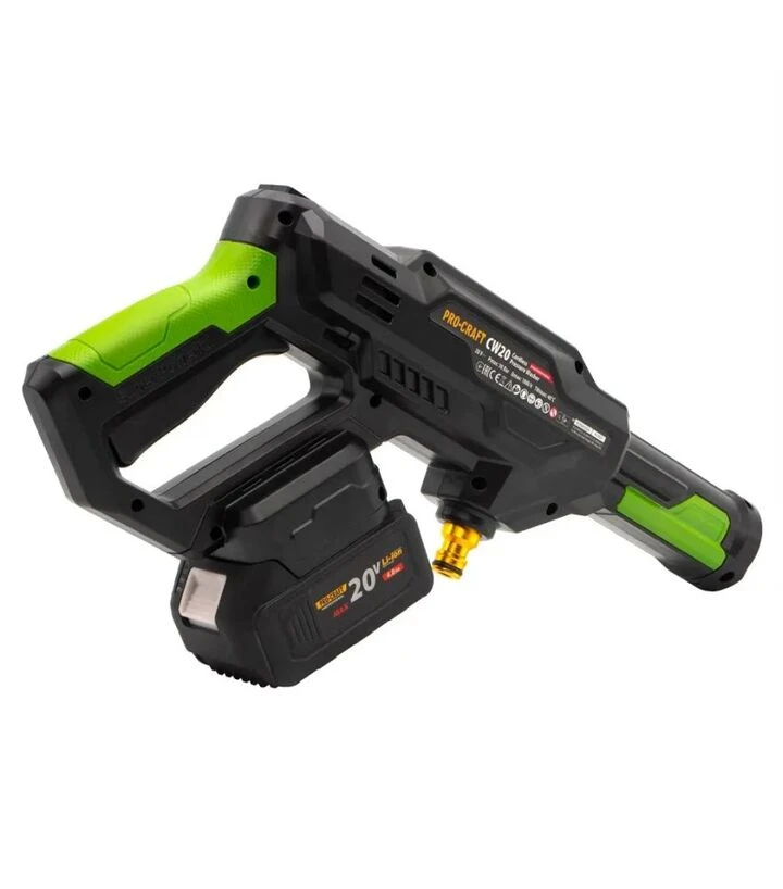 Procraft CW-20 работает на аккумуляторной платформе, что позволяет использовать её в отдалённых местах без подключения к сети. Бесщёточный двигатель обеспечивает тихую и равномерную работу, а три режима позволяют подобрать оптимальное давление. Мойка может работать как от крана, так и от ёмкости с водой, что делает её универсальной в условиях выездных работ.