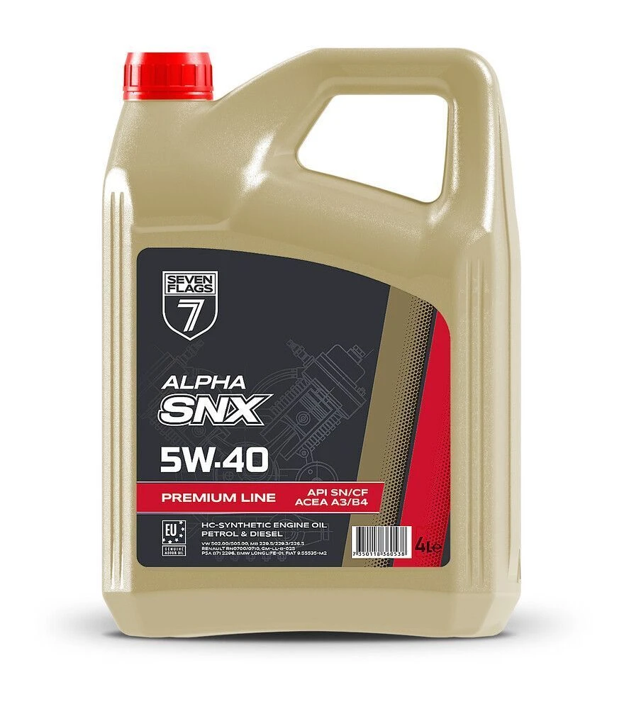 7FLAGS ALPHA SNX 5W-40 - синтетическое моторное масло для бензиновых и дизельных двигателей легковых автомобилей. Подходит для моторов с турбонаддувом, каталитическим нейтрализатором и прямым впрыском, а также для автомобилей с увеличенным интервалом замены. Обеспечивает стабильное смазывание, защиту от износа и чистоту двигателя в условиях городского и смешанного режима.