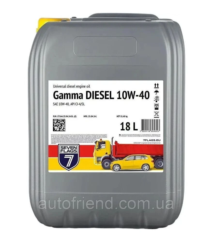Моторное масло 7FLAGS GAMMA DIESEL 10W-40 API CI-4/SL - полусинтетическое масло для дизельных двигателей коммерческой техники, обеспечивающее стабильную защиту, чистоту системы и всесезонную работу в тяжёлых условиях.