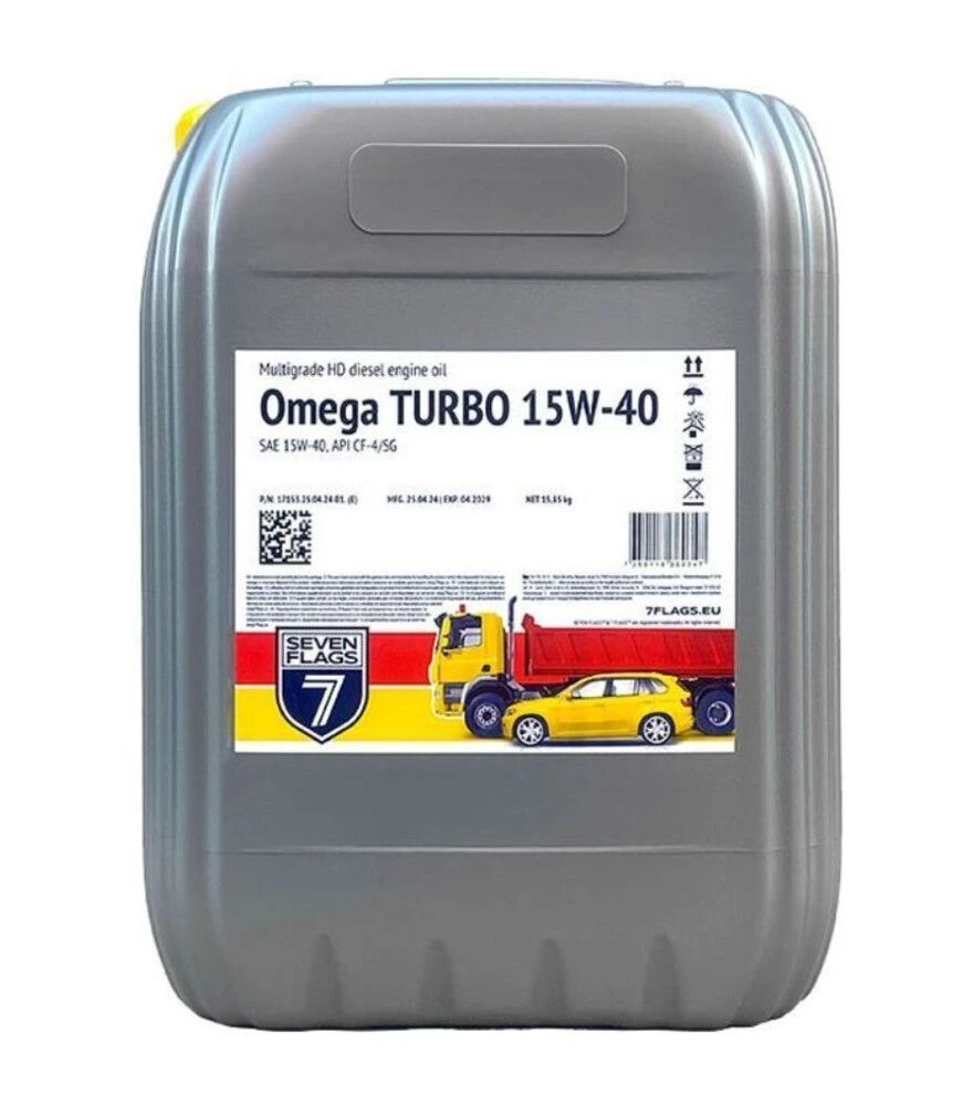 Моторное масло 7FLAGS OMEGA TURBO 15W-40 API CF-4 - минеральное масло для дизельных двигателей тяжёлых грузовиков, строительной и сельскохозяйственной техники, работающей в умеренном климате и под высокими нагрузками. Обеспечивает стабильную вязкость, формирует защитную плёнку на поверхностях трения и поддерживает надёжную работу двигателя при интенсивной эксплуатации. Соответствует требованиям API CF-4 и подходит для техники с турбонаддувом.