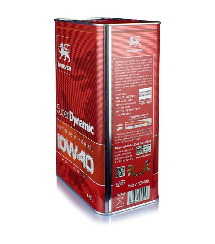 WOLVER SUPER DYNAMIC 10W-40 - полусинтетическое моторное масло для бензиновых и дизельных двигателей легковых автомобилей, включая оснащённые турбонаддувом, системами Common Rail и каталитическим нейтрализатором. Обеспечивает стабильное смазывание в разных режимах работы, поддерживает чистоту деталей и способствует экономии топлива. Благодаря сбалансированному составу и синтетическим базовым компонентам подходит для всесезонного использования.