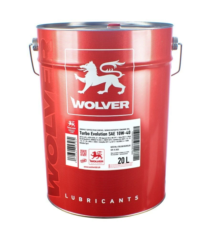 WOLVER TURBO EVOLUTION 10W-40 - полусинтетическое моторное масло для дизельных и бензиновых двигателей грузовой, коммерческой, карьерной и сельскохозяйственной техники. Создано на основе усовершенствованного пакета присадок Stable Protect, обеспечивает термическую стабильность, защиту от износа и чистоту двигателя при длительных интервалах эксплуатации. Подходит для моторов с технологиями EGR, SCR, турбонаддувом и каталитическим нейтрализатором, без использования DPF.