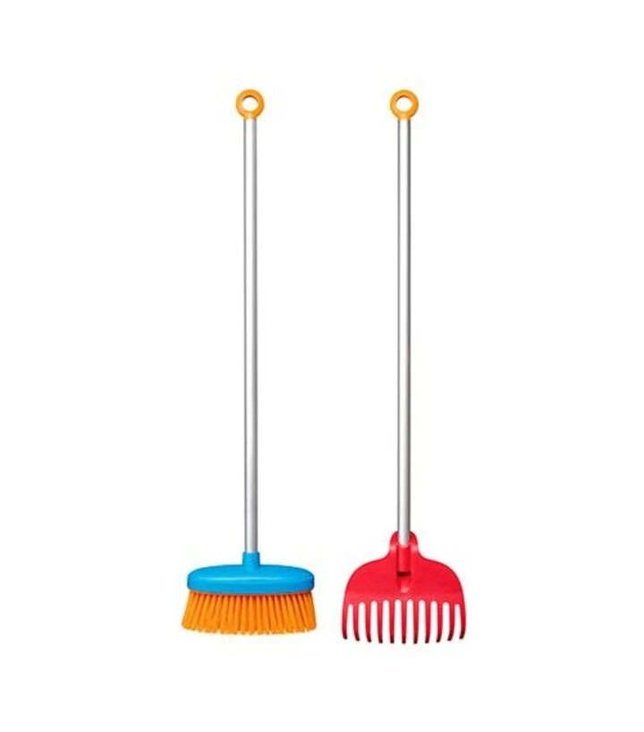 Комплект состоит из двух инструментов - метлы и граблей, каждый из которых имеет лёгкую алюминиевую ручку и пластиковую головку, усиленную волокном. Оба инструмента безопасны благодаря отсутствию острых краёв и гибким рабочим частям. Яркие цвета и большие отверстия для подвешивания делают набор удобным в хранении и привлекательным для детей, а прочные материалы гарантируют долговечность во время игры и работы.