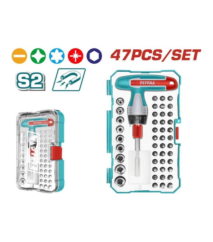 Набор TOTAL TACSD30476 сочетает биты разных стандартов и торцевые головки, что позволяет работать с различными типами крепежа в бытовых и профессиональных условиях. Т-образная отвертка обеспечивает лучший хват и эффективную передачу усилия. Большое количество насадок расширяет возможности использования набора при работе с техникой, мебелью и оборудованием.