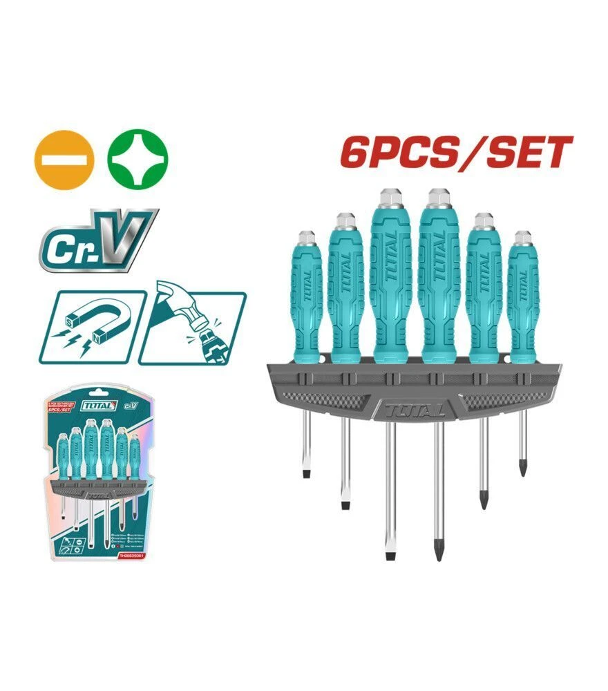 Набор TOTAL THGSS35061 включает шесть отверток разной длины и типоразмера, что позволяет работать с крепежом различной сложности. Ударная конструкция делает их пригодными для задач, где стандартные инструменты не справляются. Хромованадиевая сталь обеспечивает высокую прочность, а точные наконечники - эффективное воздействие на крепёж.