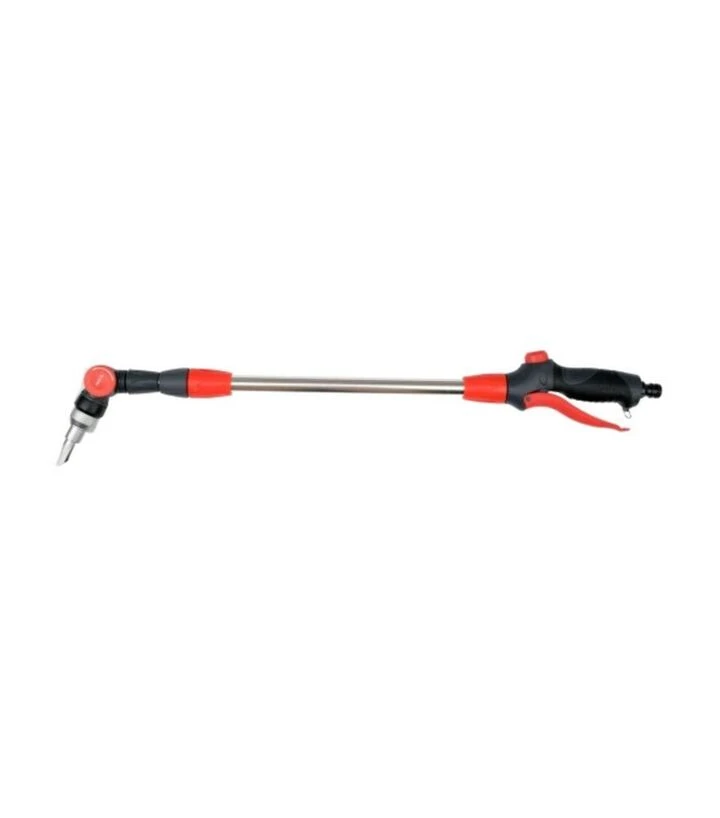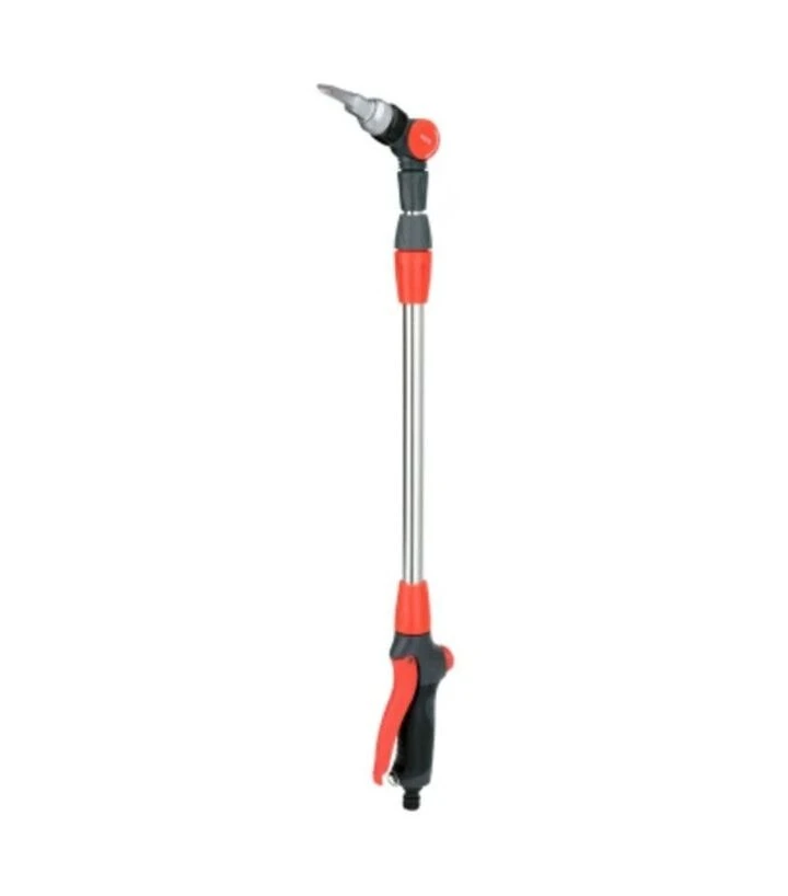 Насадка имеет телескопическую конструкцию с регулировкой длины от 71 до 95 см, металлические и пластиковые элементы для оптимального баланса прочности и веса. Она подходит для стандартных шлангов с соответствующим креплением и позволяет подавать направленную струю воды для точного полива или работ по очистке.