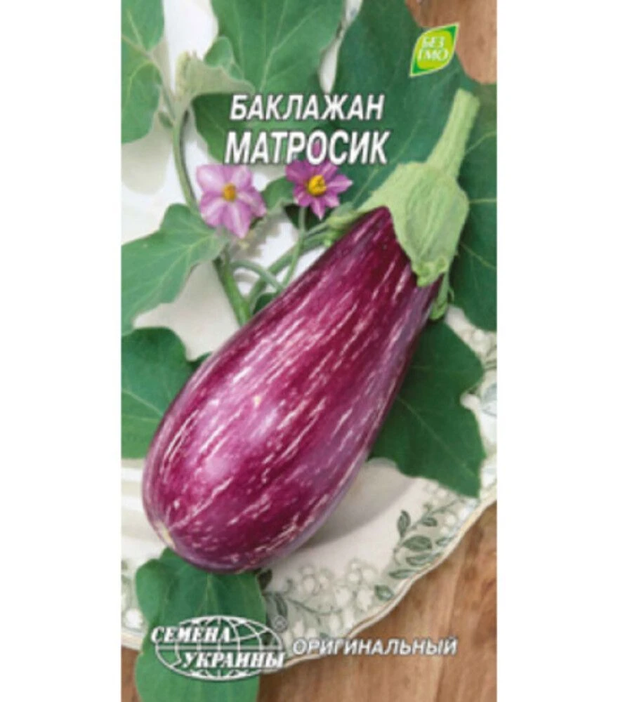 Семена баклажана Матросик - среднеранний сорт с крупными полосатыми плодами 18–20 см и массой 200–400 г. Подходит для выращивания через рассаду в открытом грунте и использования в домашней кулинарии.