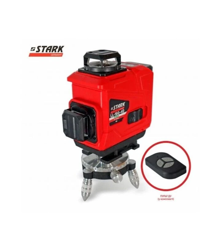 STARK LL-16G-4D работает с 16 зелёными линиями, обеспечивая возможность полного охвата плоскостей в помещении. Модель поддерживает автоматическое выравнивание, что упрощает разметку на разных высотах и плоскостях. Благодаря литий-ионным аккумуляторам прибор способен работать продолжительное время без подзарядки. В комплект входят пульт, держатели, переходник и кейс, что делает использование нивелира практичным на разных этапах работ.