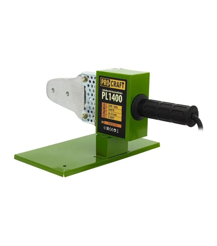 ProCraft PL-1400 - паяльник для пластиковых труб с мощностью 600 Вт, температурой 50–300°C и работой от 220 В. Подходит для диаметров 20, 25, 32 мм, имеет класс защиты I и IP24 и предназначен для монтажных работ в мастерской и на объекте.