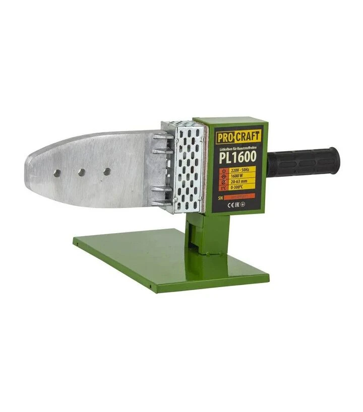 ProCraft PL-1600 - паяльник для пластиковых труб 800 Вт с температурой 50–300°C, временем нагрева 3 минуты и поддержкой диаметров 20, 25, 32, 40, 50, 63 мм. Работает от 220 В, имеет класс защиты I и категорию IP24 для монтажных работ.