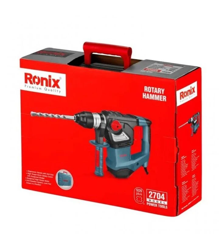 Ronix 2704 предназначен для интенсивной работы в тяжёлых условиях. Вес 4,9 кг соответствует классу мощных перфораторов. Модель оснащена производительной ударной системой, тремя режимами и регулировкой положения зубила. Двойная антивибрация уменьшает утомляемость при длительном долблении. Электроника стабилизирует обороты, а металлический корпус защищает внутренние узлы.