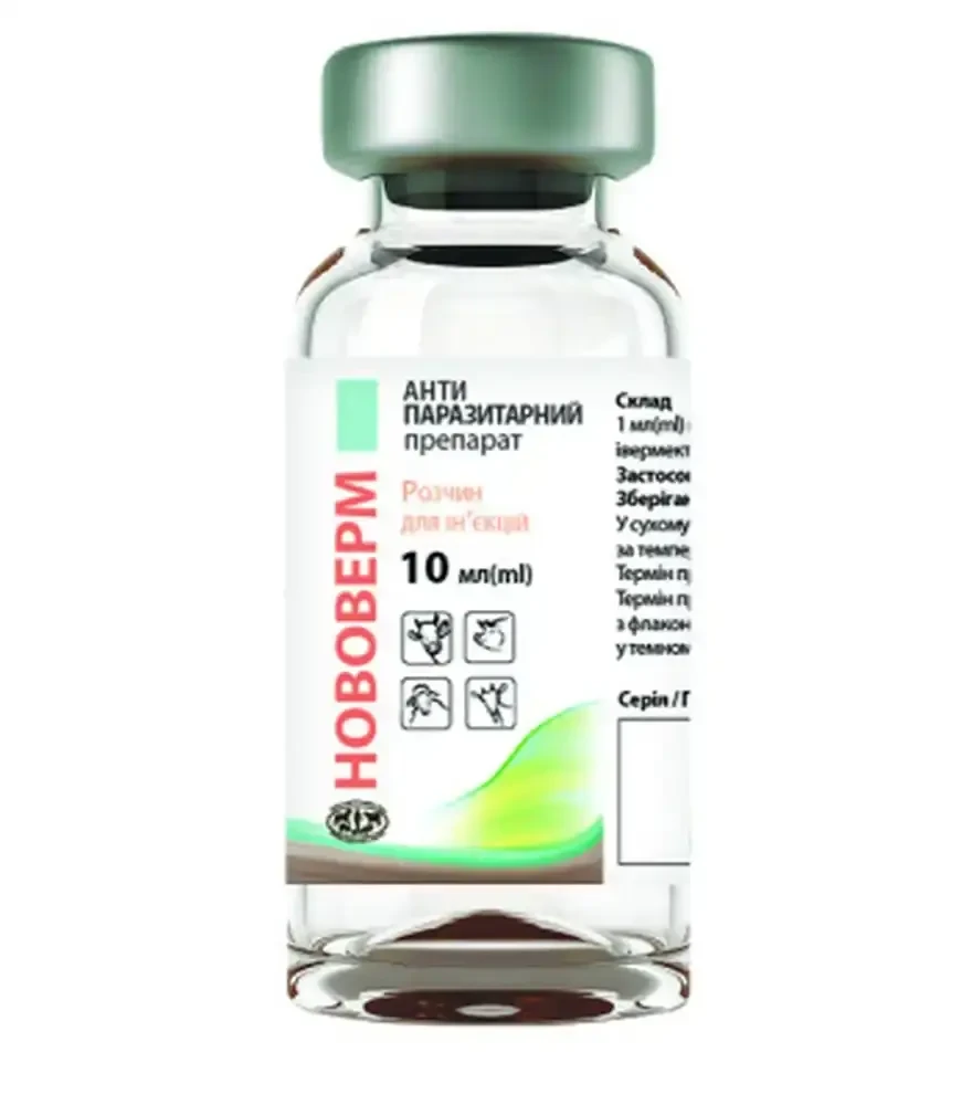 Противопаразитарный препарат Нововерм 1% — инъекционный антигельминтный препарат на основе аверсектина С (10 мг/мл) для КРС, овец, коз, свиней и лошадей. Действует на вредных нематод и эктопаразитов. Подходит для профилактики и лечения наиболее распространённых гельминтозов и арахнометозов.