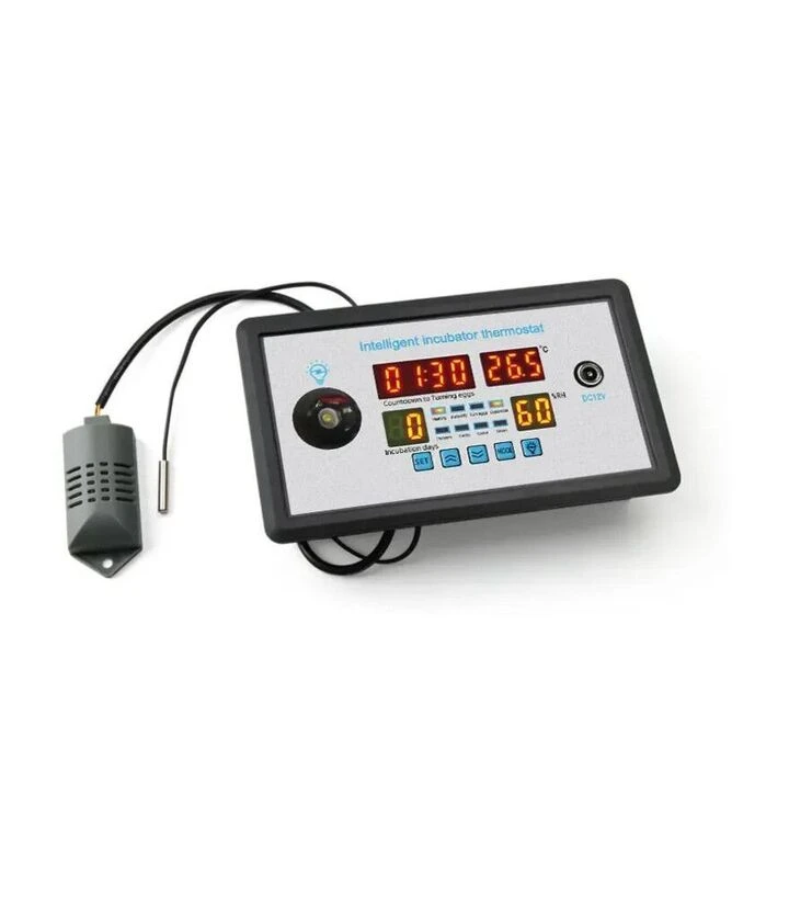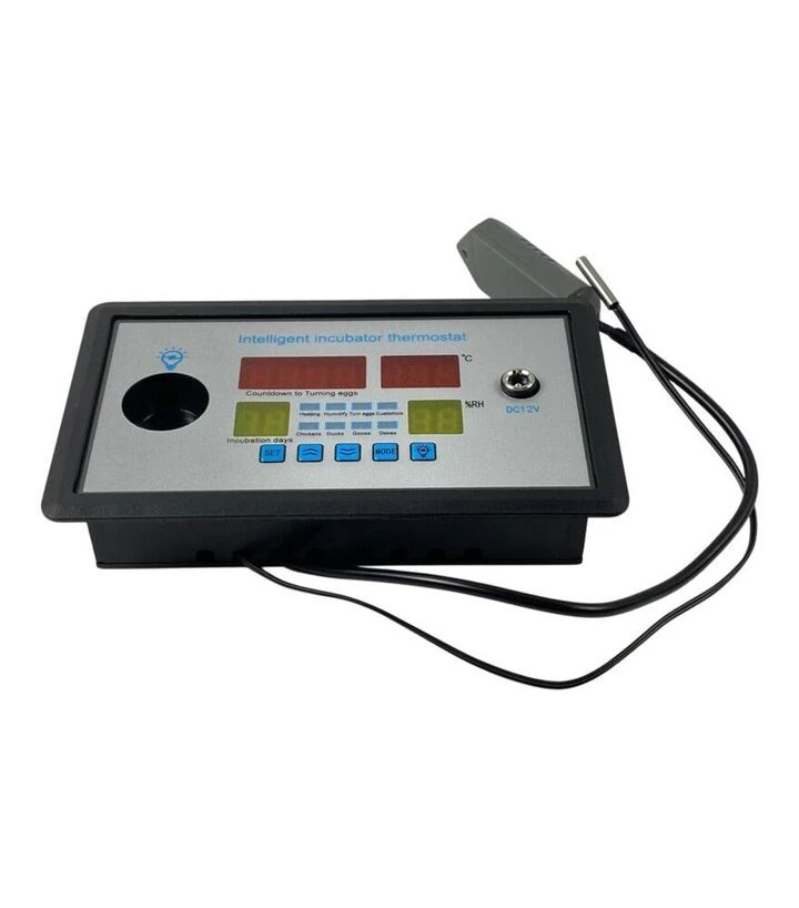 Тип - цифровой, электронный программируемый. Корпус изготовлен из пластика. Оснащен дисплеем для отображения температуры и влажности. Подходит для инкубаторов вместимостью до 100 яиц.