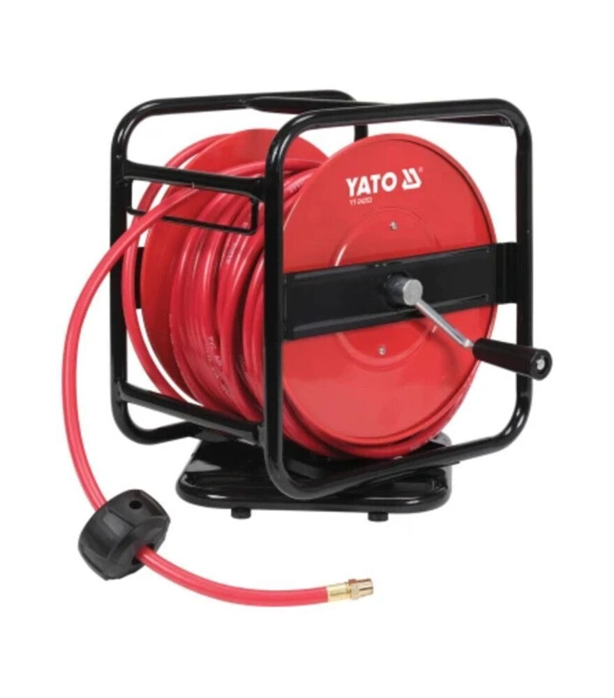 YATO YT-24253 - длинный и удобный пневматический шланг на катушке для работы на расстоянии. Отлично подходит для хозяйства, мастерской или СТО, где требуются гибкость, мобильность и стабильная подача воздуха.
