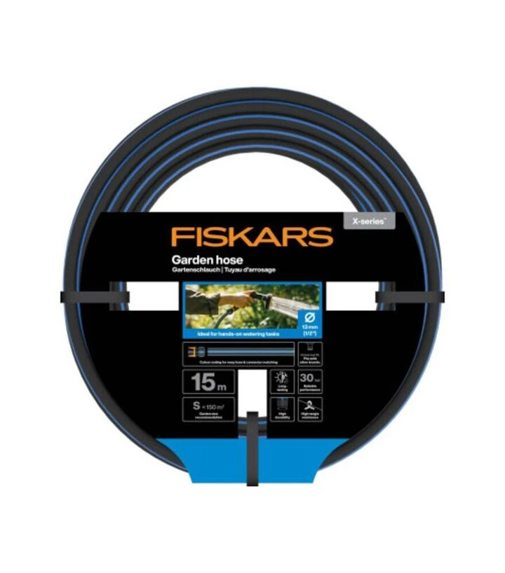 Садовый шланг Fiskars X-series™ 15 м - удобное решение для ручного полива и мытья, созданное с учётом практичности и долговечности. Благодаря диаметру 13 мм (1/2"") и гибкой конструкции шланг легко использовать на небольших и средних участках. Главное преимущество модели - повышенная устойчивость к перекручиванию, что снижает риск перегибов и обеспечивает стабильный поток воды. Цветовая маркировка помогает быстро подобрать подходящий коннектор, а универсальное подключение делает шланг совместимым с поливочными системами других брендов.