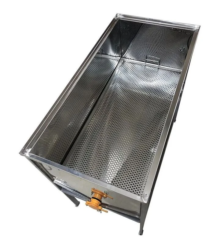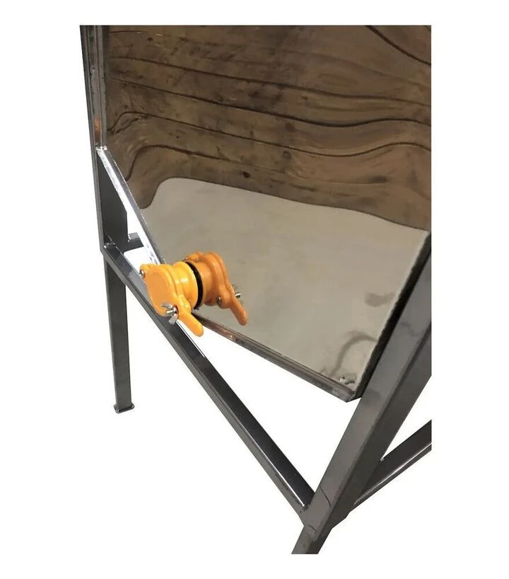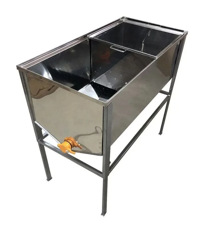 Стол для распечатывания сот 1 м, пластиковый кран (1601P) сочетает ванну с уклоном к сливу, глубокую корзину для забруса и упор для рамки. Телескопические ножки упрощают размещение и хранение, а нержавеющая сталь AISI 304 в рабочих частях подходит для сезонной работы с мёдом.