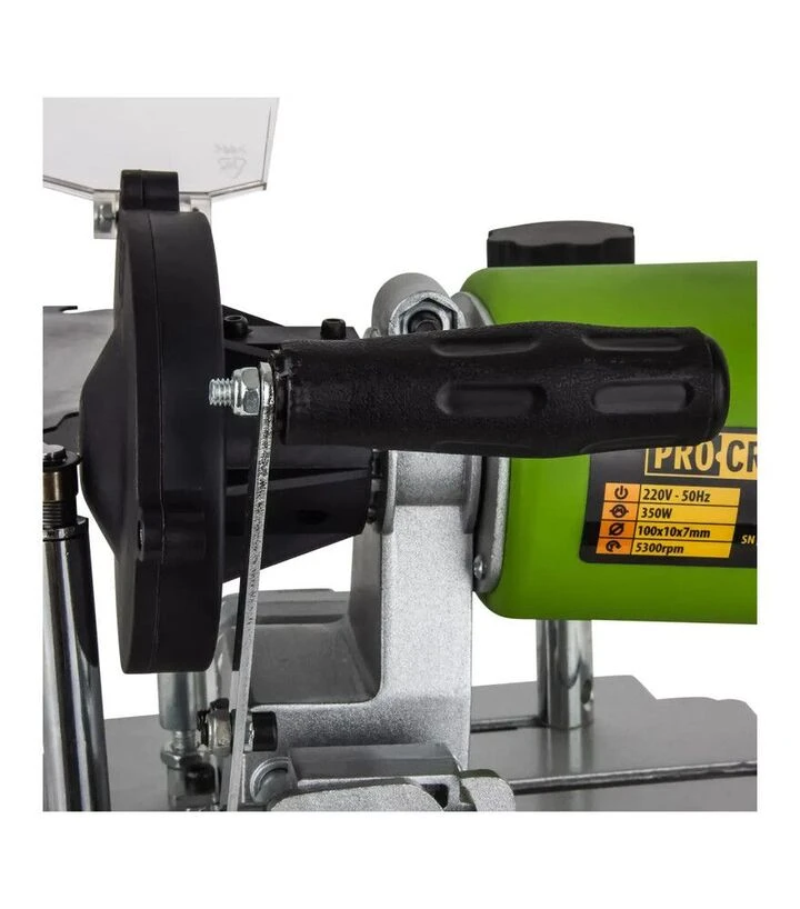 ProCraft SS-350 - настольный станок для заточки пилочных дисков, который помогает восстанавливать режущую кромку и поддерживать качество реза. Работает от сети 220 В, имеет мощность 110 Вт и скорость холостого хода 5300 об/мин для работы с шлифовальным камнем. Подходит для дисков диаметром 90–400 мм, поэтому может использоваться с оснасткой от компактных пил до более крупных торцовочных и циркулярных дисков в пределах указанного диапазона. Шлифовальный камень имеет размер 100/20/1,2 мм.
