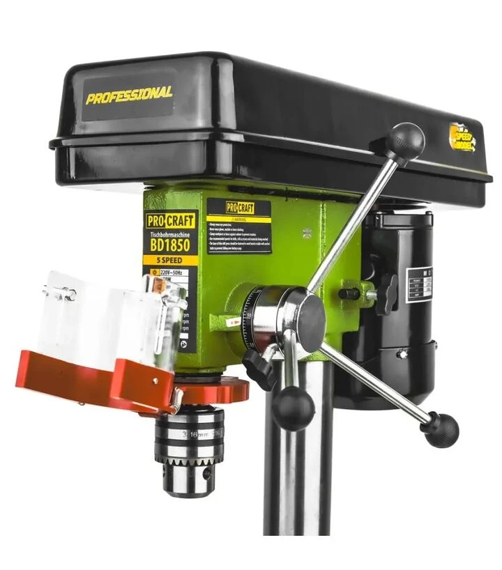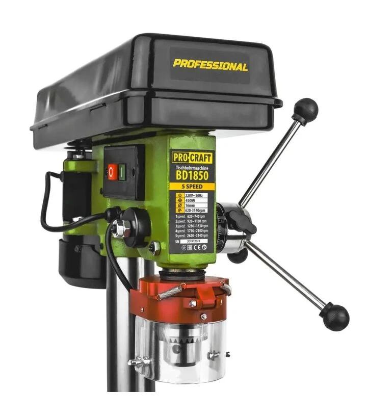 Сверлильный станок Procraft BD-1850 (018501) Procraft BD-1850 - стационарный сверлильный станок мощностью 450 Вт, предназначенный для точной обработки древесины, металла и пластика. Оснащён ключевым патроном 16 мм и поддерживает диапазон скоростей от 620 до 3140 об/мин. Благодаря максимальному крутящему моменту 55 Нм подходит для сверления даже твёрдых материалов. Комплектация включает тиски, защитный экран и крепление для установки на стол, а некоторые версии оснащены поворотным столом для удобной работы под углом. ProCraft - бренд, предлагающий практичные инструменты для бытового и полупрофессионального применения, акцентируя внимание на простоте и эффективности.