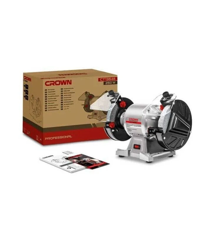 Точильный станок CROWN CT13546, 250 Вт, 150 мм, 2840 об/мин Станок CROWN CT13546 - это настольное точильно-шлифовальное оборудование для мастерских, гаражей и хозяйств, где есть потребность в регулярном обслуживании режущего инструмента или металлообработке. Мощность 250 Вт позволяет работать с более крупными деталями, а скорость 2840 об/мин обеспечивает эффективное шлифование и заточку. Оснащён двумя дисками диаметром 150 мм, которые подходят для обработки большей площади. Имеет защитное стекло, устойчивую базу с резиновыми ножками и настольное крепление для безопасной эксплуатации.