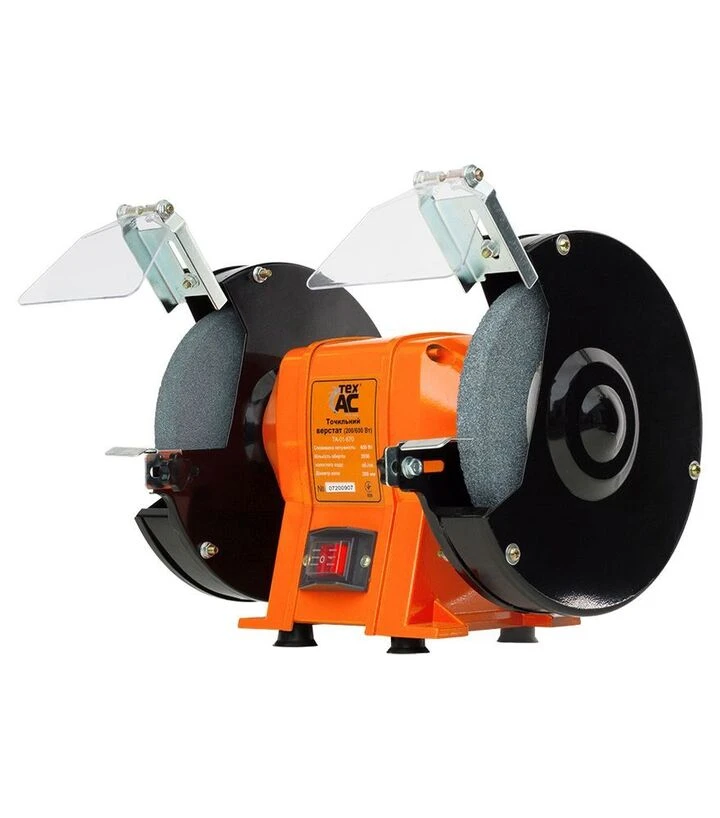 Tex.AC TA-01-670 - это стационарный точильный станок повышенной мощности (600 Вт), предназначенный для обработки металлических инструментов и деталей. Благодаря большому диаметру точильных кругов - 200 мм - и высокой скорости вращения 2950 об/мин модель эффективно выполняет как заточку, так и грубое шлифование. Оснащён двумя дисками, защитными экранами, упорами и удобной кнопкой пуска с влагозащитой. Вес 8,8 кг обеспечивает достаточную устойчивость при работе без лишних вибраций.
