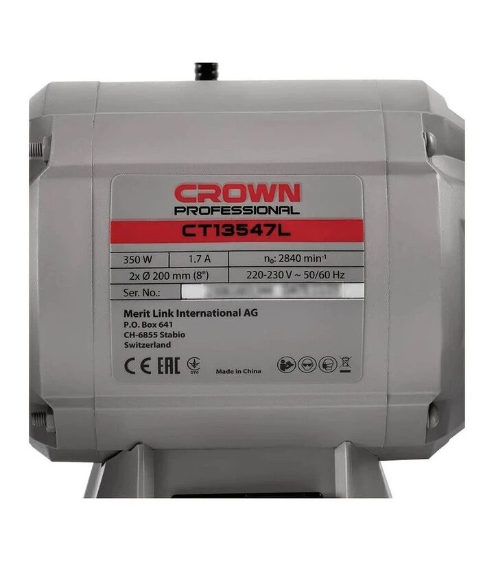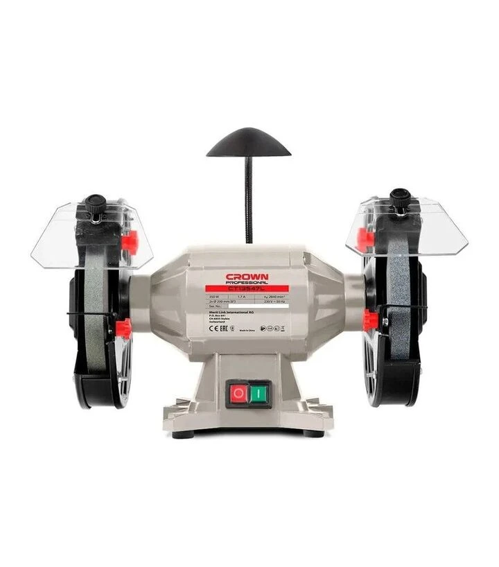Заточной станок CROWN CT13547L, 350 Вт, 200 мм, 2840 об/мин CROWN CT13547L - это стационарный заточной станок с подсветкой рабочей зоны, разработанный для интенсивной эксплуатации в мастерских, на производстве или в фермерском хозяйстве. Мощность 350 Вт и скорость 2840 об/мин позволяют обрабатывать твёрдый металл, доводить и шлифовать инструменты, а также выполнять грубую и точную заточку. Два диска диаметром 200 мм обеспечивают большую рабочую площадь. Защитное стекло, боковые кожухи, резиновые ножки и встроенная лампа гарантируют безопасную и комфортную работу.