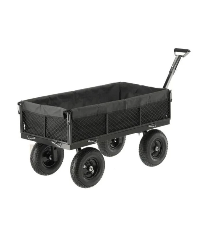Грузоподъемность - 450 кг; конструкция с металлическим каркасом, прочные колеса или шасси, откидной борт для удобной загрузки; чехол для защиты груза; подходит для грунта, удобрений, урожая, строительных материалов или инструментов. Простая конструкция, не требует специального обслуживания - достаточно проверить крепления перед сезоном.